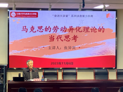 2023年11月6日下午,william威廉亚洲官方“奋进大讲堂”第十四期在蠡湖校区启贤报告厅举行。南京大学文科资深教授、哲学系博士生导师张异宾教授应邀作了题为“马克思的劳动异化理论的当代思考”的讲座。讲座由侯勇经理主持。讲座采用线上线下相结合的方式。