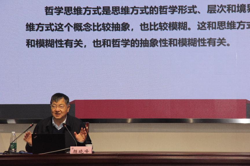 讲座伊始,颜晓峰教授向在场师生讲述了思维的特征以及方式和特点,他认为,层次的区分不是高低贵贱的区分,每一种思维方式都是连接人与世界的一种关系和途径,都是人的思维所必备的;层次的区分不是截然分开、毫不相干的,而是互相包含、互相贯通、互相渗透的,实际的科学思维方式必须包含经验的、艺术的、哲学的思维方式,区分只是理论研究的需要。