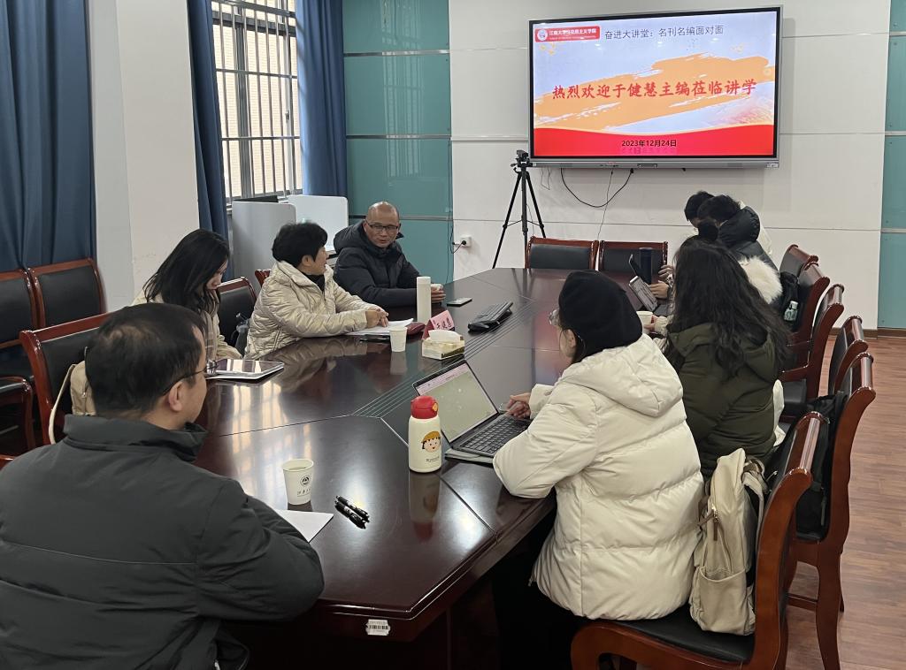 2023年12月24日上午,“奋进大讲堂:名刊名编面对面”在公司B113会议室举行,中共黑龙江省委党校(黑龙江省行政公司)学术交流部副主任、《行政论坛》副主编于健慧教授受邀出席,讲座由副经理刘俊杰教授主持,陈永杰教授参加,公司部分师生参与。