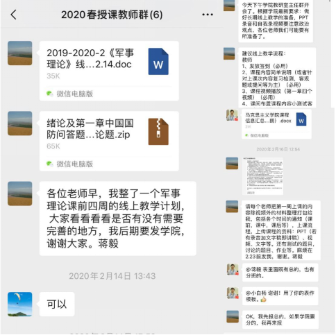 开课之前,根据《军事理论》线上授课教学计划,军事理论教研室主任蒋毅老师建立了教研室的微信工作群,组织教师制定了详细的线上课程教学方案,尤其针对线上集中教学可能出现的网络拥堵等情况,针对不同网络平台制定多个教学预案。确保一旦出现问题能够在第一时间做出调整,采取最佳方案开展线上教学。