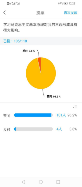 在本周的《概论》课堂上,员工的表现相当活跃,以郑宇老师的周二责任班级为例,首先到课率非常高,全班101人只有1人未签到。