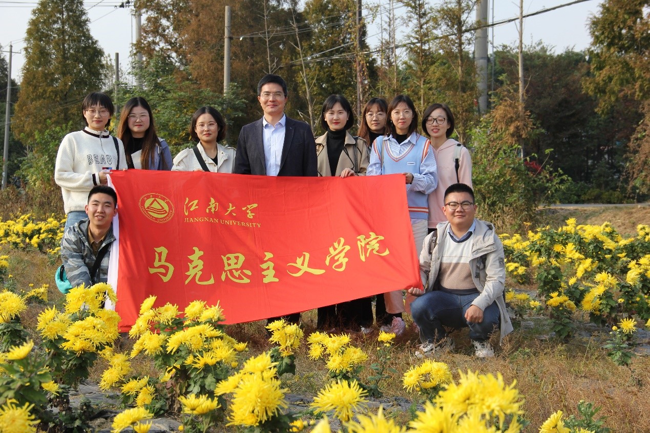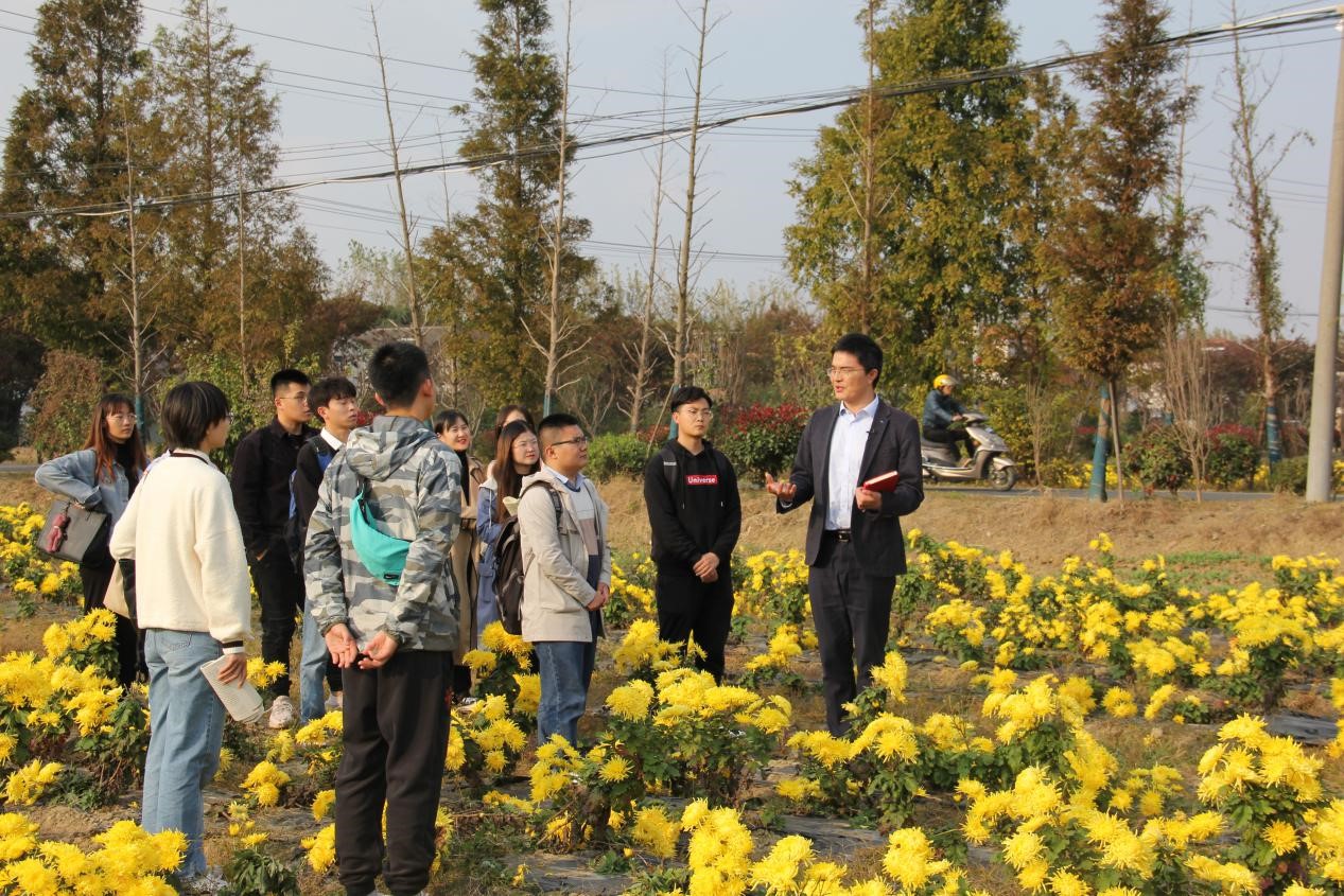 在现场授课过程中,侯勇教授带领同学们参观了山联村村容村貌,并深入田野之中开展了一场生动的思政教学。侯教授通过引用有关菊花的古诗词引出乡村振兴话题,指出以特色产业为中心的发展模式与乡村振兴战略的密切联系;接着侯教授围绕十九届五中全会关于乡村振兴的重要论述来进一步深化同学们的理论基础,他指出党中央历来高度重视“三农”问题,乡村振兴战略是当下我国“十四五”规划的重要部署,同时也是学术界关注的焦点,乡村振兴应在现实问题导向下围绕“为了谁、依靠谁、谁评价、成果由谁共享”而聚力发力。最后,研究生会刘晓彤和张任同学围绕乡村振兴相关话题与侯教授进行了互动交流。刘晓彤同学以“农村拆迁中农民惰性增加”的问题向侯教授请教,侯教授针对这一提问从充分发挥乡贤作用带动良好乡风的形成,做到扶贫与扶志、扶智的有机统一方面作出了详细解答。张任同学针对“农村空心化”表达了自己的看法,侯教授从“区域发展”和“建立激励机制”的角度进行了解答。