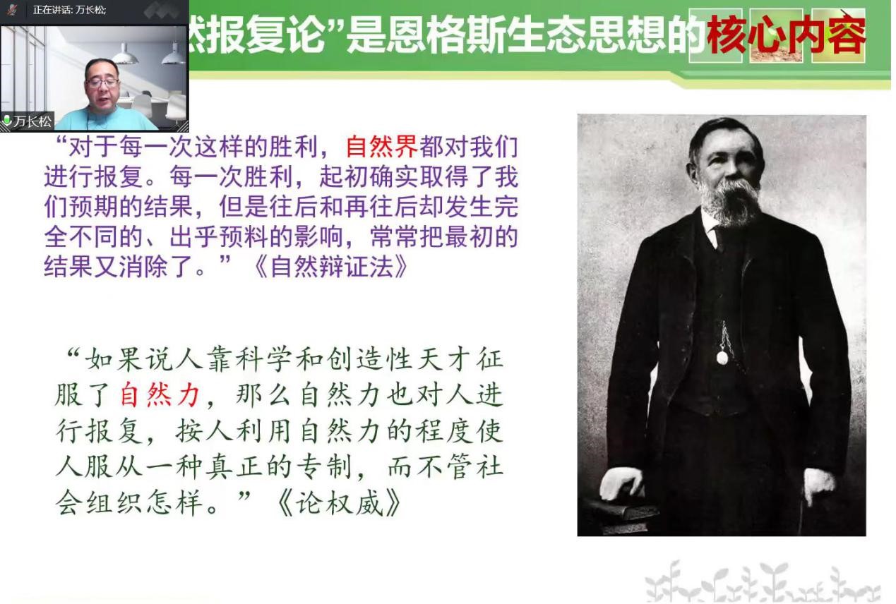 2022年5月6日晚,第二十期“太湖耘林”系列学术讲座如期而至,公司万长松教授受邀开展了以“防疫期间重温恩格斯的‘自然报复论’”为主题的专题讲座。由于疫情防控的需要,本次讲座以线上直播的形式开展。公司2020、2021级硕士研究生参加了本次讲座,讲座由汝曼曼同学主持。