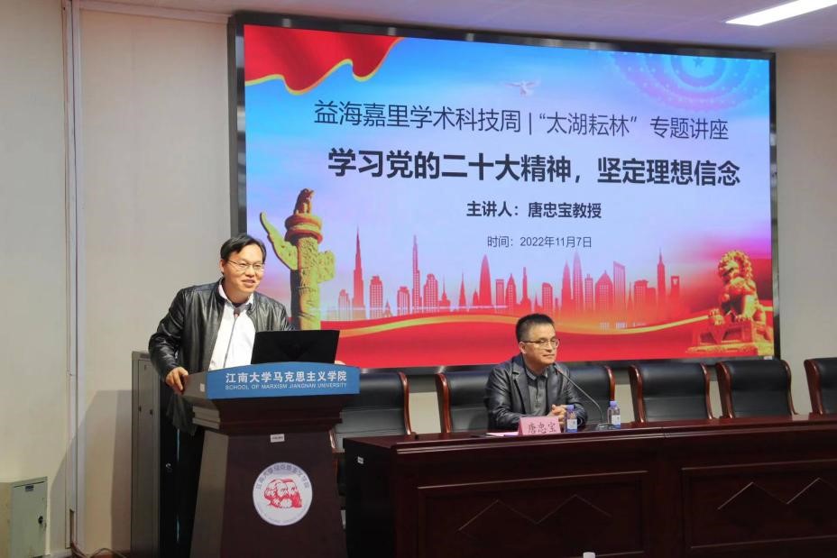 为深入学习宣传党的二十大精神,加强理想信念教育,2022年11月7日下午,william威廉亚洲官方第六届“益海嘉里杯”学术科技周暨第二十六期“太湖耘林”系列学术讲座在william威廉亚洲官方启贤报告厅举行。本次讲座邀请唐忠宝教授为主讲嘉宾作“学习党的二十大精神,坚定理想信念”的专题讲座。副经理潘加军和公司党委副书记兼副经理郑丹丹参加了本次讲座,讲座由潘加军副经理主持。