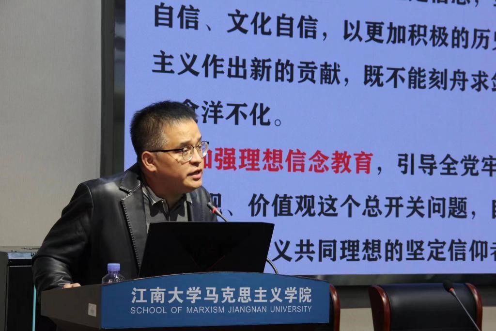 唐忠宝教授以党的二十大报告中推动理想信念教育,持续抓好“四史教育”,解决好“世界观、人生观、价值观”这个总开关问题为中心展开讲解,分别从“为什么必须反对历史虚无主义”、“为什么要信仰马克思主义”、“中国共产党人的天下情怀”三个方面进行讲授。